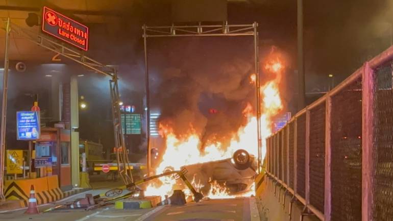 ไฟไหม้รถ SUV หลังชนเสาด่านเก็บเงินดอนเมืองโทลเวย์ พลิกคว่ำ คนขับระบุเดินทางมาจากย่านรังสิตมุ่งหน้ากลับบ้านที่อนุสาวรีย์ชัยแต่เกิดอาการวูบ