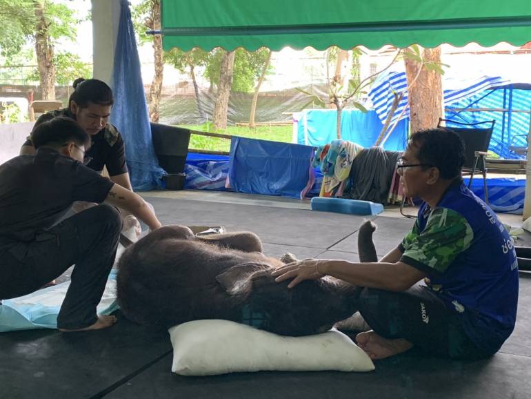 สัตวแพทย์ทำการรักษาแผลต่อเนื่อง รักษาแผลกดทับบริเวณสะโพกทั้ง 2 ข้าง เลเซอร์รักษาลดการอักเสบและการบวมของแผล นวดและยืดเหยียดขา รวมถึงใช้เครื่องอัลตร้าซาวน์รักษาเพื่อเป็นการกายภาพ ทั้งนี้ทีมสัตวแพทย์ประเมินอาการลูกช้างป่าทุกครั้งก่อนการทำกายภาพ หากสภาวะร่างกายปกติจึงจะทำกายภาพ