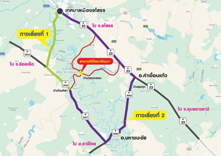 2. หากเดินทางจาก อ.พนมไพร ใช้เส้นทาง ทล.2043 อ.พนมไพร จ.ร้อยเอ็ด ไปยัง อ.มหาชนะชัย จ.ยโสธร 20 กิโลเมตร ถึง อ.มหาชนะชัย เลี้ยวซ้ายใช้ ทล.2083 ตรงไป อ.คำเขื่อนเเก้วอีก 28 กิโลเมตร เจอสี่แยกไฟแดง อ.คำเขื่อนแก้ว จ.ยโสธร แล้วเลี้ยวซ้ายมุ่งเข้า จ.ยโสธร อีก 20 กิโลเมตร