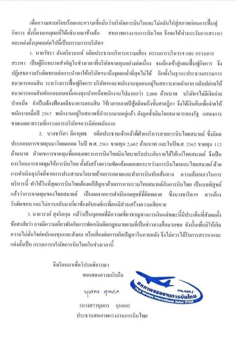 ขณะที่ น.ส.บุษกร กุนอก ประธานสหภาพแรงงานการบินไทย ส่งหนังสือถึงประธานกรรมการ บริษัทการบินไทย จํากัด (มหาชน) คัดค้านการแต่งตั้งบุคคลเป็นกรรมการบริษัทฯ โดยระบุว่าคณะกรรมการบริษัทชุดใหม่จะต้องแตกต่างจากอดีต ต้องเป็นผู้มีความรู้ความสามารถเพียงพอกับธุรกิจการบิน บริหารงานได้โดยอิสระ ปราศจากการครอบงําจากผู้มีอํานาจทางการเมือง