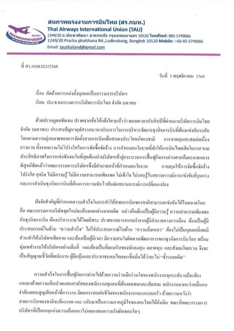 สหภาพแรงงานการบินไทยส่งจดหมายถึงประธานบอร์ดฯ คัดค้านแต่งตั้ง 3 บอร์ดใหม่ เบื้องต้นรายชื่อที่จะเสนอบอร์ดพิจารณา ขณะนี้เสนอรายชื่อเข้ามากว่า 16 คนและต้องคัดให้เหลือ 8 คน คาดจะได้รายชื่อ 6 พ.ย.นี้