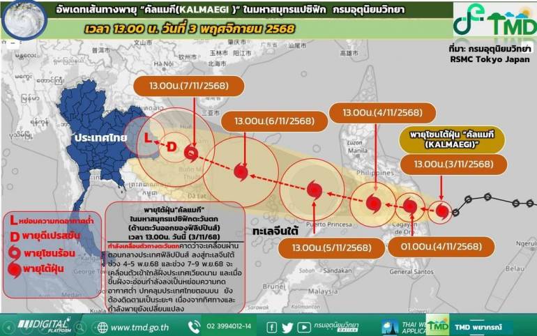 วันนี้ (3 พ.ย.2568) กรมอุตุนิยมวิทยาอัปเดตเส้นทางพายุ "คัลแมกี" ทวีกำลังแรงเป็นพายุไต้ฝุ่น กำลังเคลื่อนตัวทางตะวันตก คาดว่าจะเคลื่อนผ่านตอนกลางประเทศฟิลิปปินส์ ลงสู่ทะเลจีนใต้ ช่วงวันที่ 4-5 พ.ย.นี้ และช่วงวันที่ 7-9 พ.ย.จะเคลื่อนตัวเข้าใกล้ฝั่งประเทศเวียดนาม เมื่อขึ้นฝั่งแล้วจะอ่อนกำลังลงเป็นหย่อมความกดอากาศต่ำปกคลุมประเทศไทยตอนบน ซึ่งยังคงต้องติดตามเป็นระยะ ๆ เนื่องจากทิศทางและกำลังพายุยังเปลี่ยนแปลง