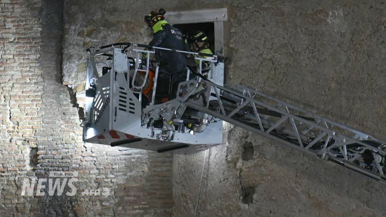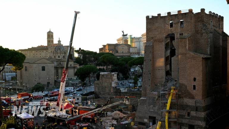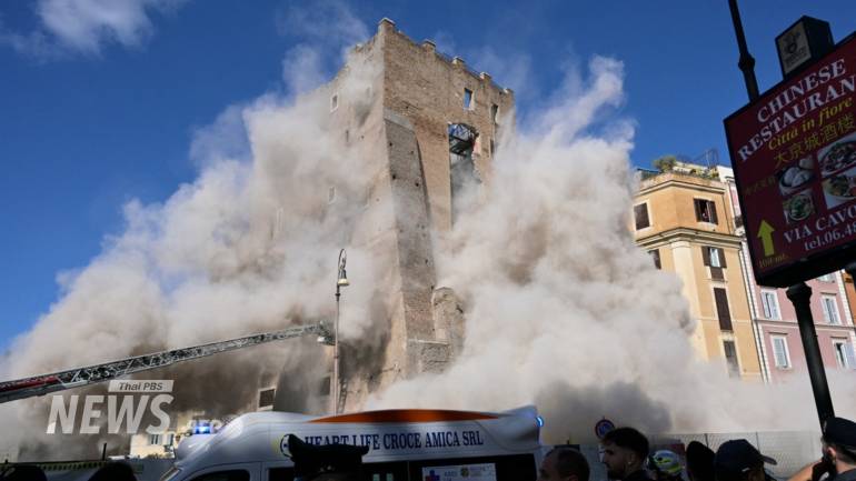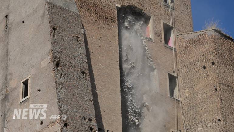 เกิดเหตุหอคอยยุคกลางในกรุงโรมของอิตาลีค่อย ๆ พังลงมา จนฝุ่นฟุ้งกระจายไปทั่วบริเวณ ห้อมล้อมเจ้าหน้าที่ซึ่งอยู่บนรถกระเช้าระหว่างกำลังเข้าไปบูรณะอาคาร