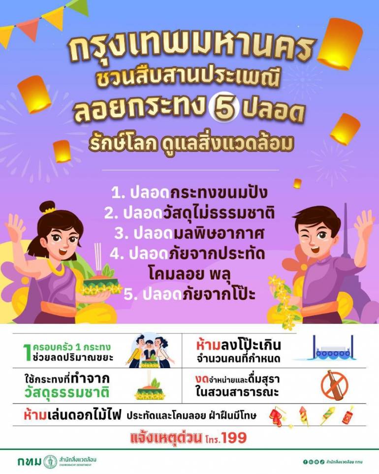 สำหรับปีนี้ กรุงเทพมหานคร ขอความร่วมมือ ประชาชนใช้กระทงที่ผลิตจากวัสดุธรรมชาติ เช่น หยวกกล้วย ใบตอง เนื่องจากย่อยสลายง่าย และไม่ใช้กระทงโฟม พร้อมขอความร่วมมือไม่ลอยกระทงขนมปัง และกระทงที่ทำจากอาหารสัตว์ในสวนสาธารณะ กทม. เนื่องจากสระน้ำในสวนเป็นพื้นที่ปิดเมื่อสัตว์น้ำกินไม่หมดจะส่งผลทำให้น้ำเสีย