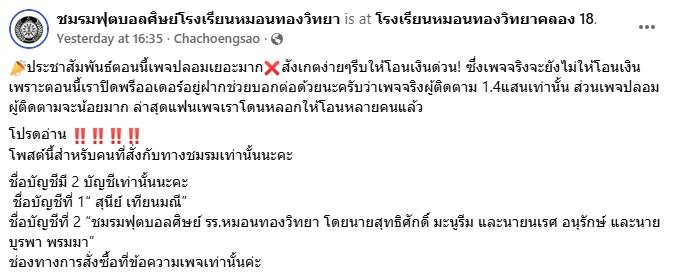 เมื่อวันที่ 12 พ.ย.2568 กระแส "หมอนทองฟีเวอร์" จากทีมฟุตบอลโรงเรียนหมอนทองวิทยา ไม่ได้จำกัดอยู่แค่นักเตะ แต่ลุกลามมาถึงเสื้อทีมกีฬาด้วย บริษัทผู้ผลิตที่ได้รับอนุญาตจากโรงเรียนแจ้งยอดสั่งซื้อพุ่งหลักหมื่นตัว สร้างความต้องการสูง แต่เจอะปัญหาผลิตไม่ทัน ส่งผลให้เกิดเพจปลอมและเสื้อปลอมขายทางออนไลน์ระบาดหนัก บางคนโอนเงินไปแล้วไม่ได้สินค้า บางคนได้แต่ของปลอม ทำให้แฟนบอลหันมารอซื้อที่โรงงานโดยตรงเพื่อความมั่นใจ