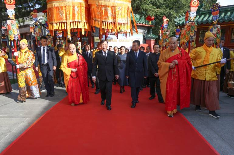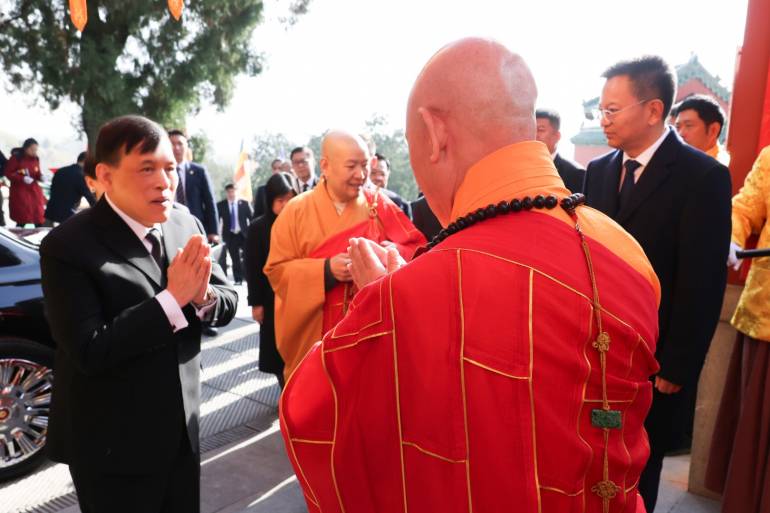 เมื่อเสด็จพระราชดำเนินถึง มีพระมหาคณาจารย์เหยี่ยนเจว๋ (Most Venerable Yanjue) ประธานพุทธสมาคมจีน (เทียบเท่าสมเด็จพระสังฆราชของไทย) พระอาจารย์ฉางจ้าง (Venerable Changzang) เจ้าอาวาสวัดหลิงกวง รอรับเสด็จ พร้อมด้วยบุคคลสำคัญ และพุทธศาสนิกชนชาวจีน