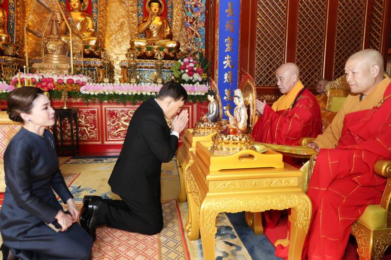 จากนั้น พระบาทสมเด็จพระเจ้าอยู่หัว และสมเด็จพระนางเจ้าฯ พระบรมราชินี ทรงจุดธูปเทียนเครื่องทองน้อยสักการะพระบรมสารีริกธาตุ บรรพชิตจีนเจริญพระพุทธมนต์