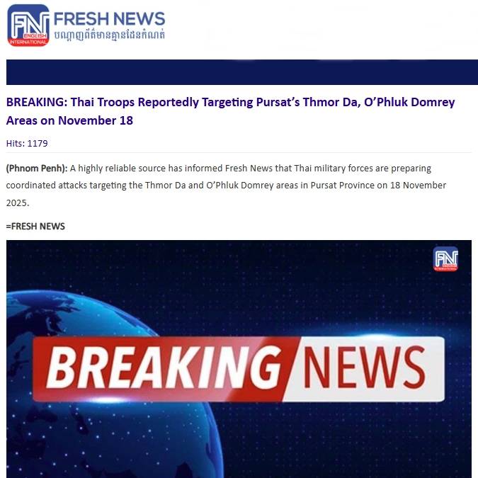 เมื่อวันที่ 16 พ.ย.2568 เวลา 21.33 น. สำนักข่าวเฟรช นิวส์ สื่อกัมพูชา รายงานข่าวด่วนอ้างไทยเตรียมโจมตีในวันที่ 18 พ.ย.นี้ โดยในเนื้อหาข่าวเฟรช นิวส์ ระบุว่า แหล่งข่าวที่เชื่อถือได้แจ้งกับเฟรช นิวส์ ว่า กองทัพไทยกำลังเตรียมการโจมตี 2 พื้นที่ใน จ.โพธิสัตว์
