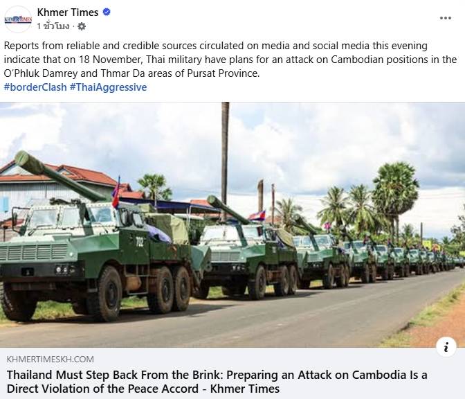 "สื่อกัมพูชา" อ้างกองทัพไทยมีแผนโจมตี 2 พื้นที่ จ.โพธิสัตว์ 18 พ.ย.