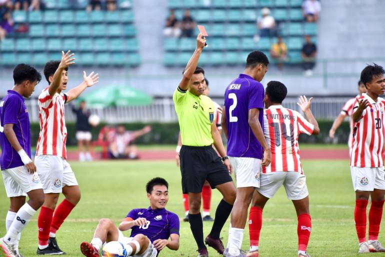 นาที 33 สถานการณ์ของอัสสัมชัญย่ำแย่ เมื่อ ณัฐพงษ์ ทองสองชั้น ผู้เล่นคนสำคัญ ไปเล่นอันตรายใส่ผู้เล่นกรุงเทพคริสเตียน ผู้ตัดสินให้ใบแดงไล่ออกจากสนาม อัสสัมชัญ เหลือ 10 คน