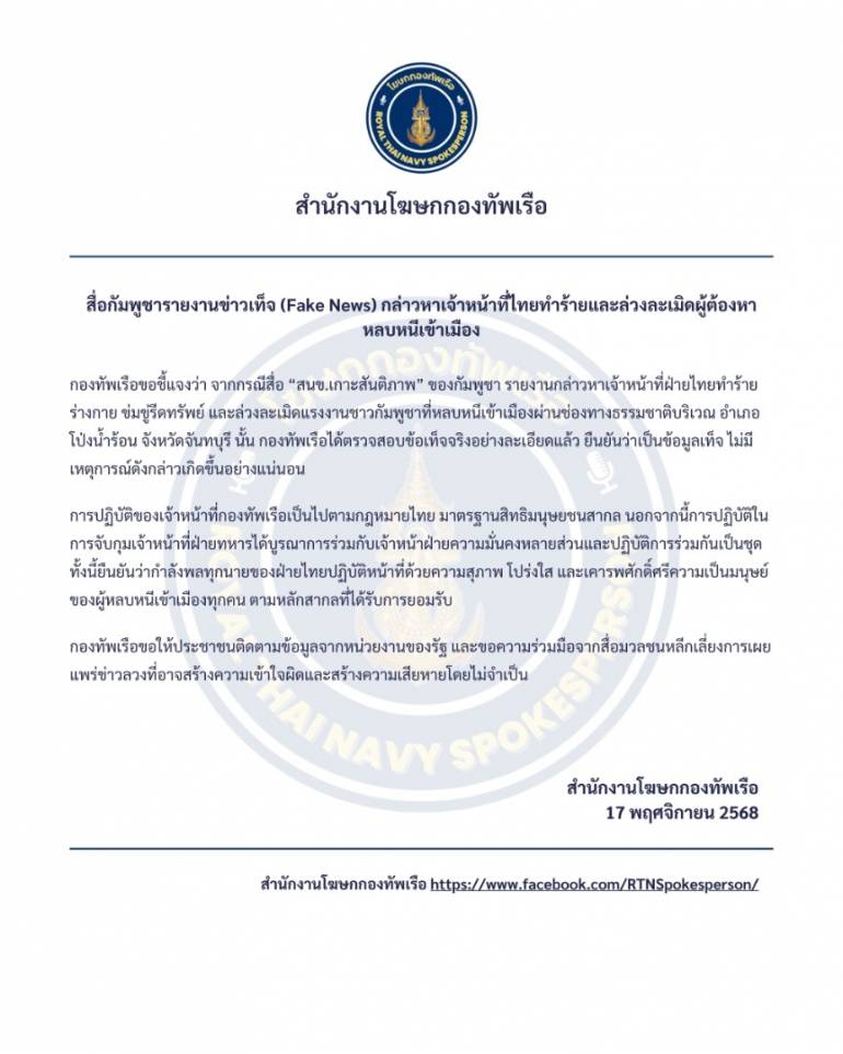 วันที่ 17 พ.ย.2567 สำนักงานโฆษกกองทัพเรือ ออกแถลงการณ์ระบุว่า กองทัพเรือ ขอชี้แจงว่า จากกรณีสื่อ “สนข.เกาะสันติภาพ” ของกัมพูชา รายงานกล่าวหาเจ้าหน้าที่ฝ่ายไทย ทำร้ายร่างกาย ข่มขู่รีดทรัพย์ และล่วงละเมิดแรงงานชาวกัมพูชา ที่หลบหนีเข้าเมืองผ่านช่องทางธรรมชาติ บริเวณ อ.โป่งน้ำร้อน จ.จันทบุรี นั้น
