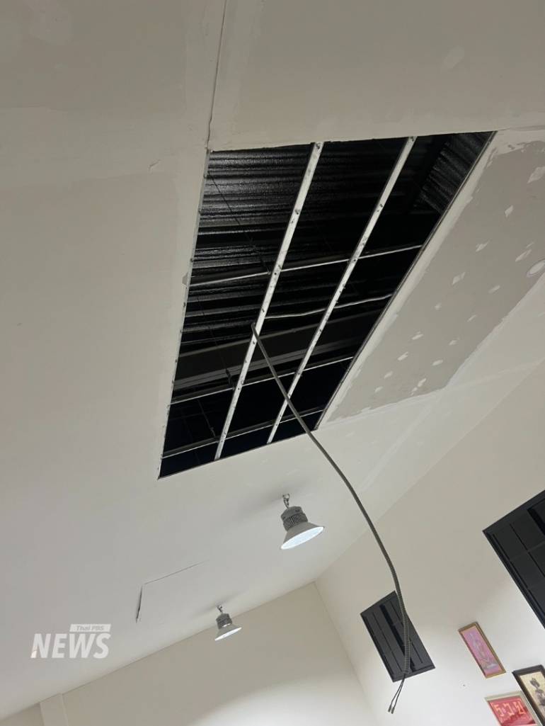 บ้านของ น.ส.สายชล คำแปง เลขที่ 159 หมู่ 9 ต.แม่กุ ฝ้าเพดานหลุดร่วงหล่นลงมาแตก คาดว่าคงต้องเปลี่ยนฝ้าเพดาน,บ้านของนายจันทร์ วาทา เลขที่ 139 หมู่ 9 ต.แม่กุ ฝ้าเพดานทะลุ