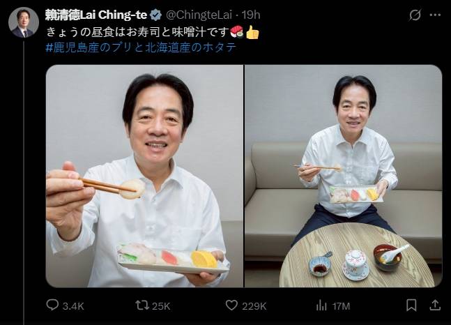 เมื่อวันที่ 20 พ.ย.2568 ไล่ ชิง-เต๋อ ปธน.ไต้หวัน เผยแพร่ภาพบน X 賴清德Lai Ching-te โดยโพสต์ภาพมือข้างหนึ่งถือจานซูชิ และอีกข้างคีบซูชิขึ้นมา เพื่อแสดงการสนับสนุนญี่ปุ่นด้วยการกินซูชิจากญี่ปุ่นเป็นมื้อกลางวัน พร้อมแคปชันที่พิมพ์เป็นภาษาญี่ปุ่น きょうの昼食はお寿司と味噌汁です #鹿児島産のブリと北海道産のホタテ แปลเป็นไทยว่า วันนี้มื้อกลางวันคือซูชิกับซุปมิโซะ #ปลาบุริจากจังหวัดคาโกชิมะ และหอยเชลล์จากฮอกไกโด