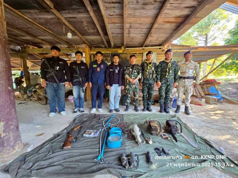 คดีที่ 3 วันที่ 21 พ.ย.2568 คณะเจ้าหน้าที่เข้าตรวจค้นบ้านพักในเขตอุทยานแห่งชาติแก่งกระจาน พบบ้านพักต้องสงสัย 1 หลัง ไม่พบบุคคลใด แต่ตรวจพบอุปกรณ์การกระทำความผิด 9 รายการ ได้แก่ ปืนลูกซองยาว 1 กระบอก, เครื่องกระสุนปืนลูกซองข 15 นัด, บ่วงแร้วดักสัตว์ 2 อัน, ซากกะโหลกหมูป่า 1 ซาก, ซากเขากวาง 1 ซาก, บาร์เลื่อยโซ่ยนต์ขนาด 22 นิ้วพร้อมโซ่, เลื่อยโซ่ยนต์ 2 เครื่อง, วิทยุสื่อสาร 1 เครื่อง และคลึงต่อไก่ 1 ชุด