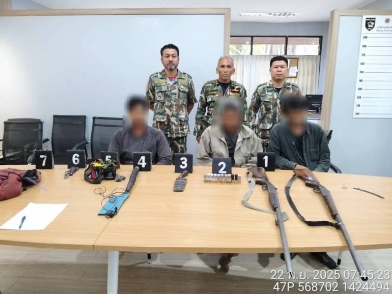 ฉก.ทส.บูรณาการกำลัง จนท.อุทยานแห่งชาติแก่งกระจาน ดำเนินการปราบปรามผู้กระทำผิดกฎหมายป่าไม้และสัตว์ป่าอย่างเข้มข้น ตรวจยึดของกลางสำคัญรวม 5 คดี ระหว่างวันที่ 20-22 พ.ย.2568 พร้อมยึดของกลางอาวุธปืน ซากสัตว์ป่าคุ้มครอง และอุปกรณ์ล่าสัตว์จำนวนมาก