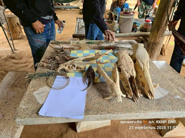คดีที่ 4 วันที่ 21 พ.ย.2568 เจ้าหน้าที่เข้าตรวจค้นบ้านพักในเขตแปลงมาตรา 64 เขตอุทยานแห่งชาติแก่งกระจาน พบการครอบครองซากสัตว์ป่า 5 รายการ คือ เขากวาง 2 กิ่ง, เขาเลียงผา 1 คู่, ซากหัวกะโหลกหมูป่า 2 หัว, ซากหัวกะโหลกเก้ง 3 หัว, ซากตีนไก่ป่า 11 คู่ และอุปกรณ์การกระทำความผิด 9 รายการ ได้แก่ ปืนลูกซองกึ่งอัตโนมัติ, เครื่องกระสุนปืนลูกซอง 7 นัด, เลื่อยโซ่ยนต์สติล 070, บาร์เลื่อยขนาด 36, 25 และ 22 นิ้ว, โซ่ยนต์ 8 เส้น, กล้องส่องกลางคืน 1 ตัว, บ่วงแร้วดักสัตว์ 11 ชุด และวิทยุสื่อสาร 2 เครื่อง
