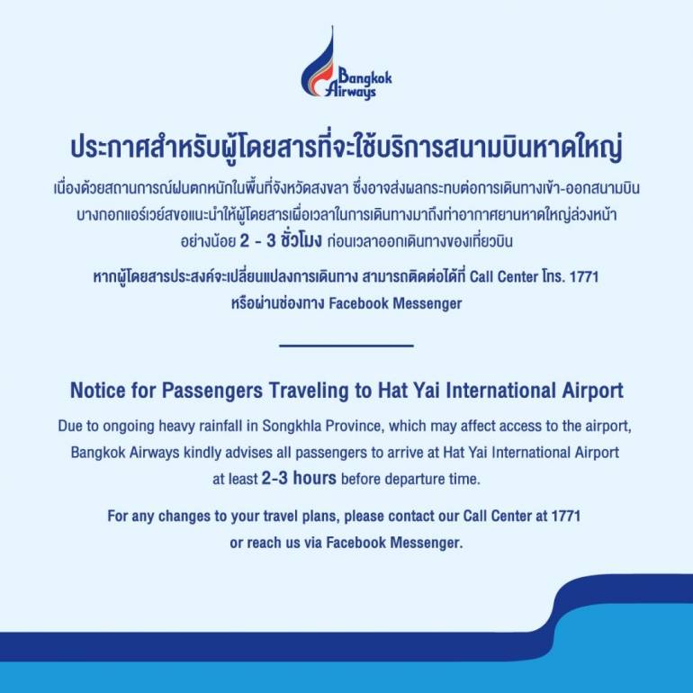 สายการบินบางกอกแอร์เวย์ส ประกาศสำหรับผู้โดยสารที่จะใช้บริการสนามบินหาดใหญ่ เนื่องด้วยสถานการณ์ฝนตกหนักในพื้นที่ จ.สงขลา ซึ่งอาจส่งผลกระทบต่อการเดินทางเข้า-ออกสนามบิน บางกอกแอร์เวย์สขอแนะนำให้ผู้โดยสารเผื่อเวลาในการเดินทางมาถึงท่าอากาศยานหาดใหญ่ล่วงหน้าอย่างน้อย 2 - 3 ชั่วโมงก่อนเวลาออกเดินทางของเที่ยวบิน