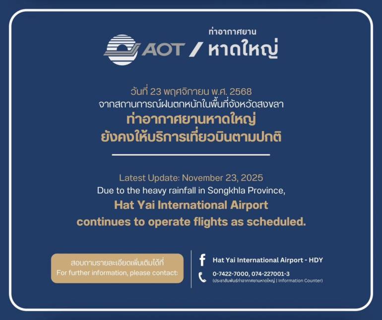 วันนี้ (23 พ.ย.2568) นางสาวนัทรียา ทวีวงศ์ ปลัดกระทรวงการท่องเที่ยวและกีฬา ได้สั่งการเร่งด่วนให้หน่วยงานในสังกัดกระทรวงฯ ที่ประจำอยู่ในพื้นที่จังหวัดสงขลา ลงพื้นที่ช่วยเหลือนักท่องเที่ยวที่ได้รับผลกระทบจากสถานการณ์น้ำท่วมในเขตอำเภอหาดใหญ่ หลังน้ำท่วมฉับพลันส่งผลให้ถนนหลายสายถูกตัดขาด นักท่องเที่ยวจำนวนมากติดค้างทั้งในสนามบิน โรงแรม และพื้นที่เสี่ยง