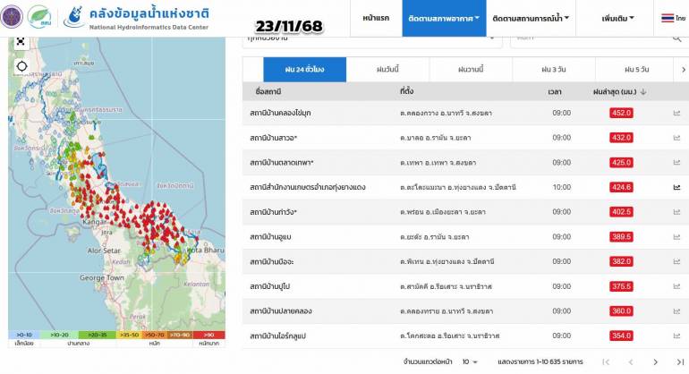 วันที่ 23 พฤศจิกายน 2568 ปริมาณฝนเพิ่มขึ้นในบริเวณภาคใต้