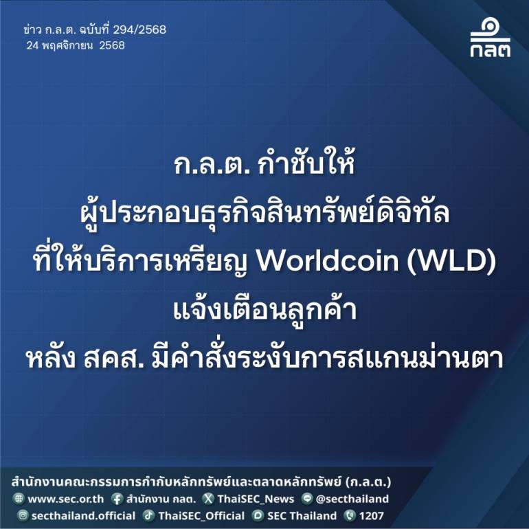 ก.ล.ต.กำชับ ผู้ประกอบธุรกิจสินทรัพย์ดิจิทัลให้บริการเหรียญ WLD  เตือนลูกค้า หลังมีคำสั่งระงับสแกนม่านตา