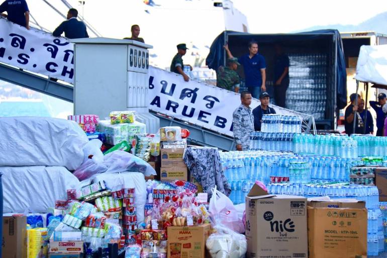 นอกจากนั้น ในส่วนของการให้การช่วยเหลือจากภาคส่วนต่างๆ กองเรือยุทธการ ได้เปิดให้กำลังพลและประชาชนร่วมบริจาคสิ่งของจำเป็นเพื่อลำเลียงไปกับเรือหลวงจักรีนฤเบศร โดยเปิดจุดรวบรวม ณ เรือหลวงจักรีนฤเบศร และ ภัณฑุปกรณ์ กองเรือยุทธการ จนถึงเวลา 20.00 น. ของวันนี้ ก่อนที่เรือหลวงจักรีนฤเบศร จะออกเดินทางไปให้การช่วยเหลือประชาชนที่ อ.หาดใหญ่ จ.สงขลา