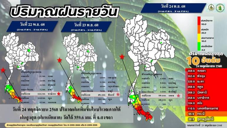 • ฝนสูงสุด (ฝนหนักมาก) วัดได้ 359.6 มม. ที่ จ.สงขลา
