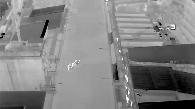 ภาพจากกล้องภาพโดรน ที่เปิดโหมดจับความร้อน เพื่อติดตามหาผู้คนที่ติดอยู่ตามบ้าน หอพัก และสถานที่ต่างๆ บนถนนสามสิบเมตร อ.หาดใหญ่ จ.สงขลา โดยจุดขาวๆ นั่นเป็นจุดความร้อนที่คาดว่าเป็นผู้ติดค้างหรือพักอาศัยในบริเวณนั้น