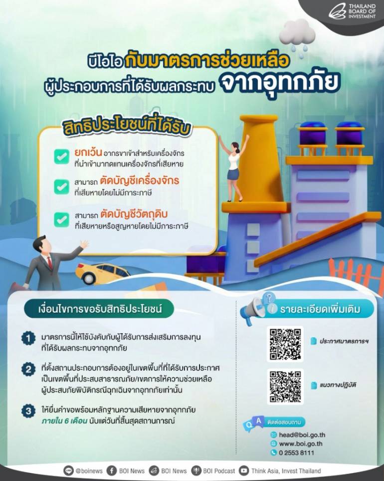 สำหรับรายละเอียด สามารถดูได้จากประกาศคณะกรรมการส่งเสริมการลงทุนที่ 15/2567 และประกาศสำนักงานที่ ป.7/2568 ซึ่งกำหนดแนวทางปฏิบัติ เช่น การขอแก้ไขโครงการ ขอรับสิทธิประโยชน์ การตัดบัญชีเครื่องจักร-วัตถุดิบ การนำเข้าเครื่องจักรทดแทน และหลักฐานแสดงความเสียหาย ผู้ประกอบการที่ได้รับการส่งเสริมและเดือดร้อนสามารถติดต่อ BOI สำนักงานใหญ่เพื่อสอบถามได้ที่โทรศัพท์ 02-553-8111 อีเมล์ head@boi.go.th หรือ Line ID: @boinews