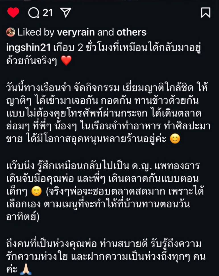 น.ส.แพทองธาร ชินวัตร โพสต์ภาพครอบครัวเข้าเยี่ยมนายทักษิณ ชินวัตร ในเรือนจำกลาง มีกิจกรรมพิเศษให้ญาติเจอกันใกล้ชิดเกือบ 2 ชม. กอดกัน กินข้าว เดินตลาดย่อม ๆ อุดหนุนอาหาร-ศิลปะจากนักโทษ อิ๊งค์ซึ้งใจบอกเหมือนกลับไปเป็นเด็กจับมือพ่อเดินตลาด