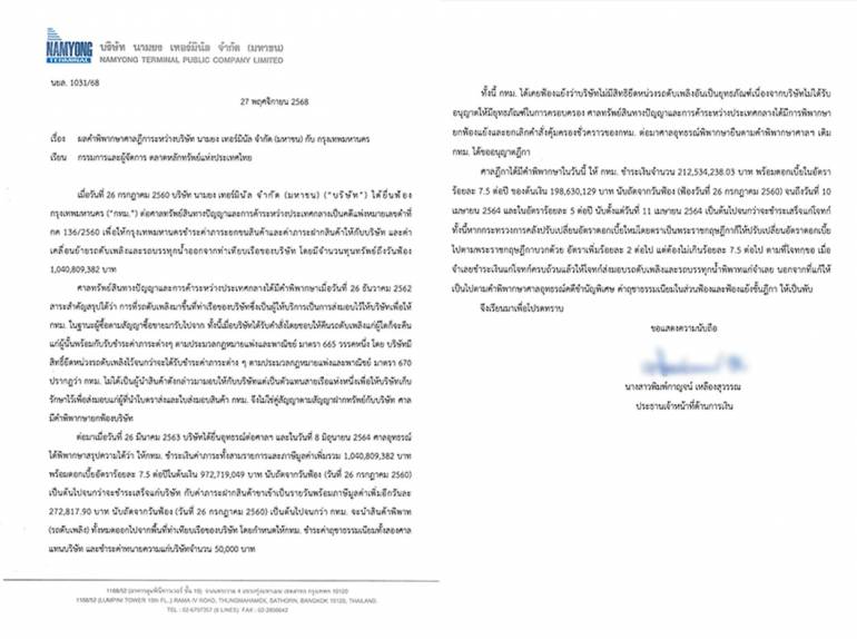 วันนี้ (27 พ.ย.2568) น.ส.พิมพ์กาญจน์ เหลืองสุวรรณ ประธานเจ้าหน้าที่ด้านการเงิน บ.นามยง เทอร์มินัล จำกัด (มหาชน) ออกเอกสารถึง กรรมการและผู้จัดการ ตลาดหลักทรัพย์แห่งประเทศไทย เรื่อง ผลคำพิพากษาศาลฎีการะหว่างบริษัท นามยง เทอร์มินัล จำกัด (มหาชน) กับ กรุงเทพมหานคร โดยมีเนื้อหา ดังนี้