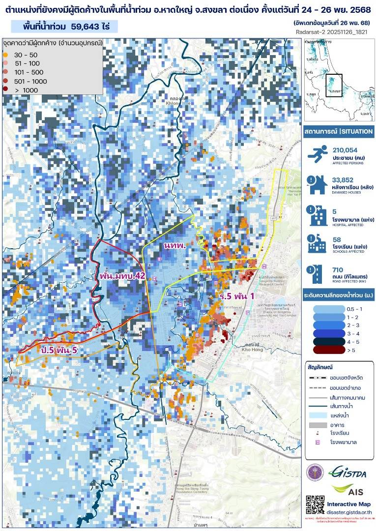 ข้อมูลภาพถ่ายจากดาวเทียม StriX-4 เมื่อวันที่ 25 พ.ย.2568 เวลา 07.20 น. ที่ GISTDA นำมาวิเคราะห์ พบพื้นที่น้ำท่วมรวม 59,643 ไร่ ครอบคลุมเขตเมืองหาดใหญ่และพื้นที่ใกล้เคียง โดยแผนที่แสดงระดับความลึกของน้ำตั้งแต่ 0.5 เมตร จนถึงมากกว่า 5 เมตร พร้อมตำแหน่งจุดใช้งานมือถือต่อเนื่องในเขตท่วม ซึ่งช่วยระบุจุดที่มีผู้อยู่อาศัยหนาแน่น โดยเฉพาะพื้นที่สีเข้มที่น้ำลึกกว่า 3-5 เมตร ซึ่งเป็นโซนอันตรายสูง