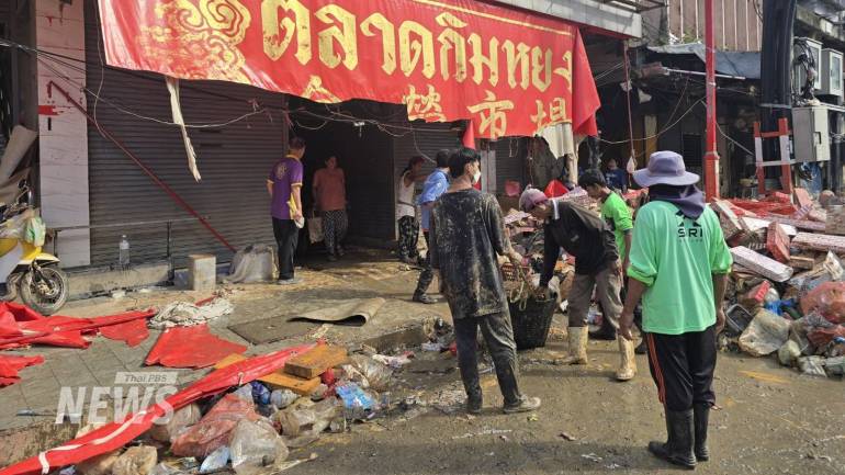 วันนี้ (29 พ.ย.2568) ผู้สื่อข่าวไทยพีบีเอส ศูนย์ข่าวภาคใต้ สำรวจตลาดกิมหยง ย่านธุรกิจสำคัญของเมืองหาดใหญ่ ที่มีร้านค้าแผงลอยรวมกันกว่า 500 แผง หลังน้ำท่วมมาตลอด 7 วันที่ผ่านมา พบว่า บริเวณชั้นที่ 1 ถูกน้ำท่วมเสียหายทั้งหมด พ่อค้าแม่ค้า เข้ามาเก็บกวาด ตรวจสอบสินค้าในแผง ทำให้ด้านหน้าตลาดมีขยะกองทิ้งไว้เป็นแนวยาว