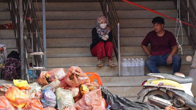 เจ้าของแผงเสื้อผ้า พยายามเข้ามาเปิดประตูม้วนที่แผง แต่น้ำท่วมทำให้กุญแจไขไม่ออก เขาเล่าว่า ปีนี้น้ำท่วมสูงถึงเพดานชั้นที่ 1 ทุกแผงที่ชั้น 1 ในตลาดกิมหยงเสียหายทั้งหมด และยังไม่สามารถประเมินค่าความเสียหายได้