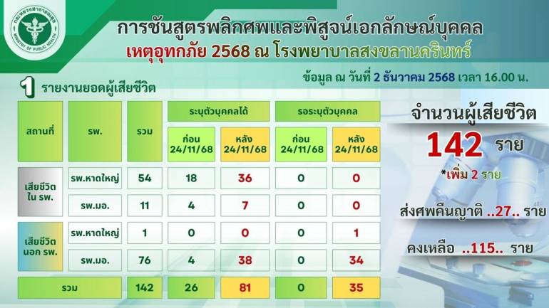 สรุปข้อมูลวันที่ 2 ธ.ค. รวมทั้งสิ้น 267 คน จำนวนนี้แบ่งเป็น จ.สงขลา เสียชีวิต 229 คน เฉพาะ อ.หาดใหญ่ มีผู้เสียชีวิต 142 คน เพิ่มจากวันที่ 1 ธ.ค.อีก 2 คน โดยส่งศพคืนญาติ 27 ศพและคงเหลือ 115 ศพ