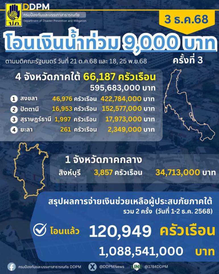 สำหรับวันนี้ (3 ธ.ค. 68) เป็นครั้งที่ 3 ของการโอนเงินเยียวยา โดย ปภ. และธนาคารออมสินจะโอนเงินให้แก่ผู้ประสบภัยที่ลงทะเบียนและผ่านการตรวจสอบข้อมูลเรียบร้อยแล้ว รวม 70,044 ครัวเรือน แยกเป็นพื้นที่ภาคใต้ 4 จังหวัด ได้แก่ สุราษฎร์ธานี ปัตตานี สงขลา ยะลา รวม 66,187 ครัวเรือน แบ่งเป็น สุราษฎร์ธานี 1,997 ครัวเรือน ปัตตานี 16,953 ครัวเรือน สงขลา 46,976 ครัวเรือน (หาดใหญ่ 5,178 ครัวเรือน) และยะลา 261 ครัวเรือน รวมเป็นวงเงินทั้งสิ้น 595,683,000 บาท