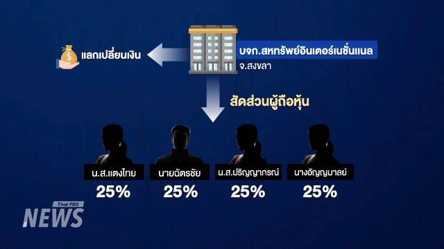 บริษัทมีชื่อ น.ส.แตงไทย ถือหุ้น ร่วมกับนายฉัตรชัย, น.ส.ปริญญาภรณ์ ซึ่งมีนามสกุลเดียวกับ "เสี่ยโจ้ ปัตตานี" ที่ถูกออกหมายจับในคดีบงการปล้นเรือน้ำมันของกลางของตำรวจน้ำ เมื่อปี 2567 และนางอัญญมาลย์ ถือหุ้นคนละ 25% จากทั้งหมด 10,000 หุ้น