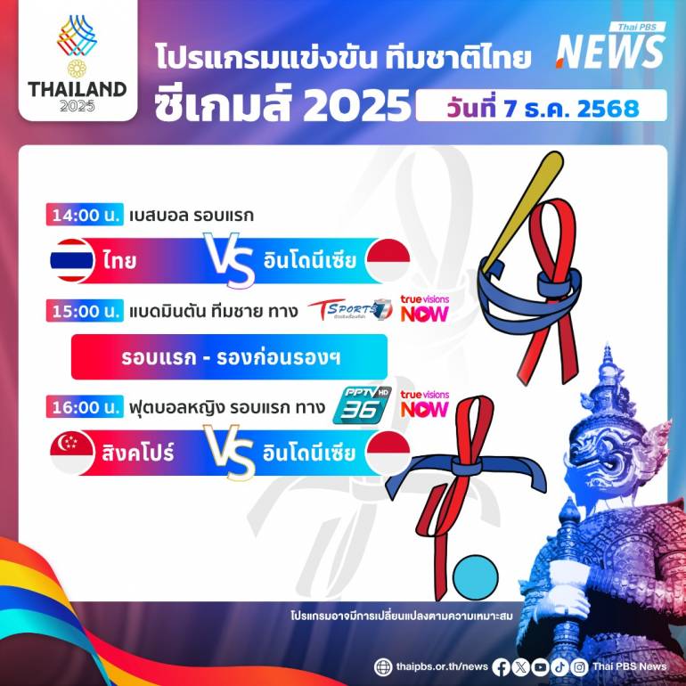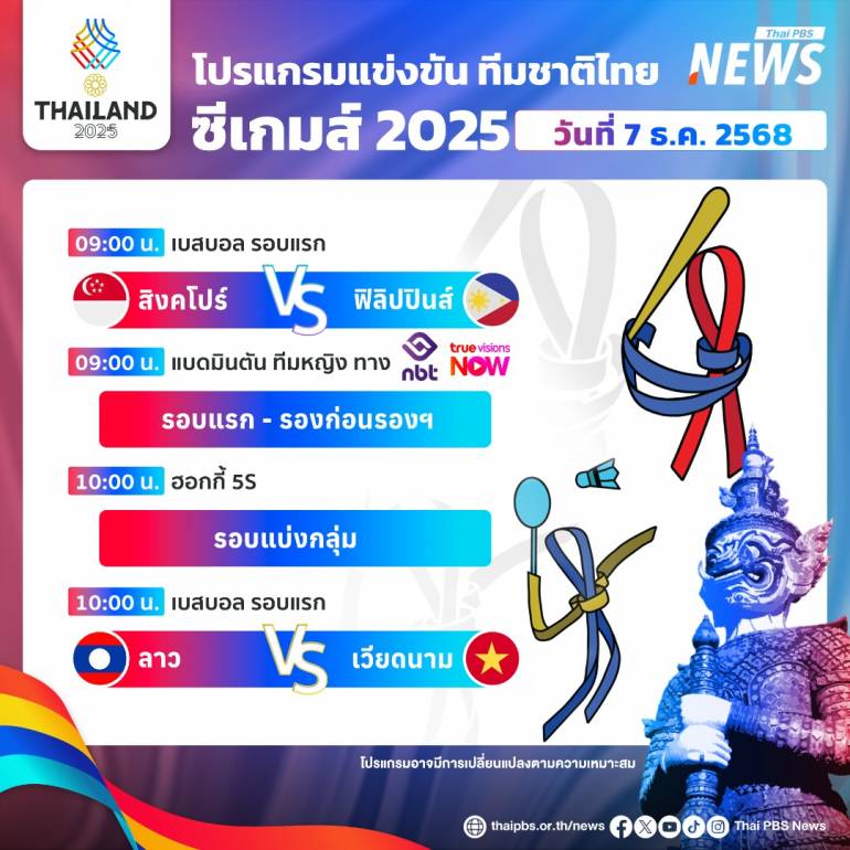 ตารางแข่งขันกีฬาซีเกมส์ 2025 วันที่ 7 ธันวาคม 2568