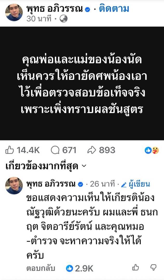 ขณะที่เฟซบุ๊กของ พุทธ อภิวรรณ ผู้ประกาศข่าวช่อง 8 โพสต์ข้อความ ครอบครัวของผู้เสียชีวิตเห็นขอบให้อายัดศพเพื่อตรวจสอบข้อเท็จจริง เพราะเพิ่งทราบผลชันสูตร และ คอมเมนต์เตือนชาวเน็ต "ขอแสดงความเห็นให้เกียรติน้องณัฐวุฒิด้วยนะครับ ผมและพี่ ธนกฤต จิตอารีย์รัตน์ และคุณหมอ -ตำรวจ จะหาความจริงให้ได้ครับ"