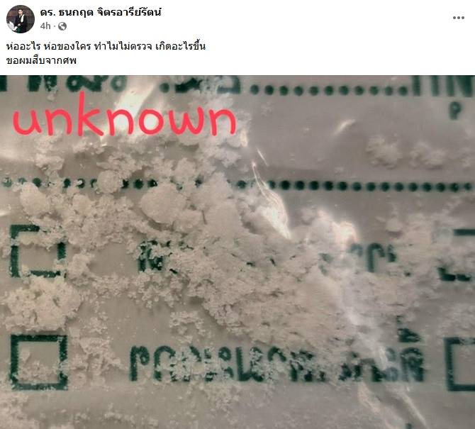 ขณะที่ ดร. ธนกฤต จิตรอารีย์รัตน์ โพสต์ข้อความว่า "ห่ออะไร ห่อของใคร ทำไมไม่ตรวจ เกิดอะไรขึ้น ขอผมสืบจากศพ" พร้อมภาพซองยาและผงสีขาวในห่อ