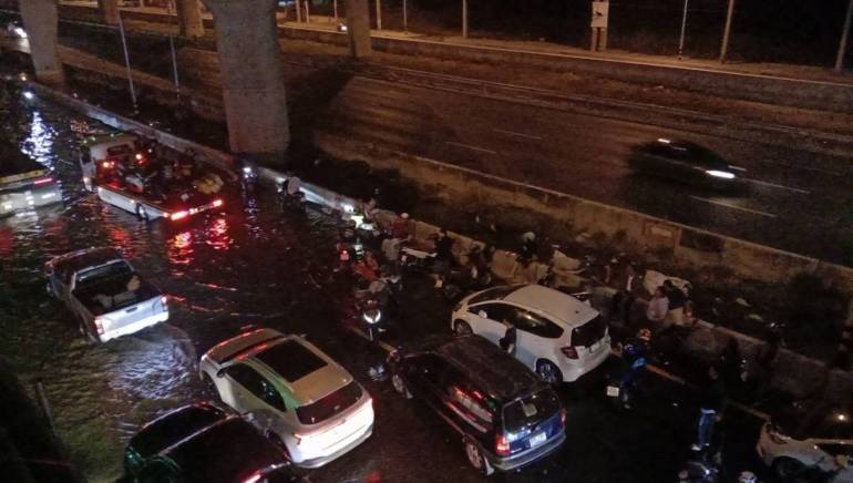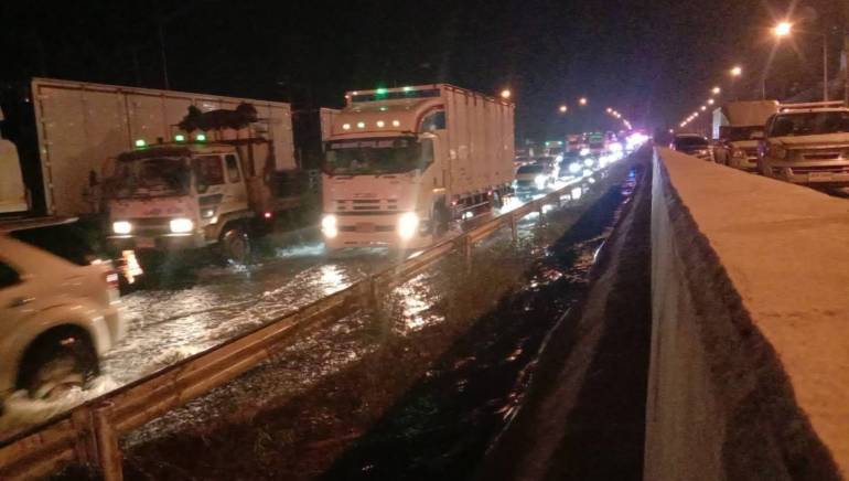 ส่วนถนนสุขสวัสดิ์ ช่วงขาออกไปสามแยกพระสมุทรเจดีย์ มีน้ำท่วมทุกช่องทางรวมกว่า 5 กิโลเมตร การจราจรเคลื่อนตัวช้า รถเล็กและมอเตอร์ไซค์ หลายคันเครื่องดับ ต้องให้เจ้าหน้าที่ช่วยเหลือ