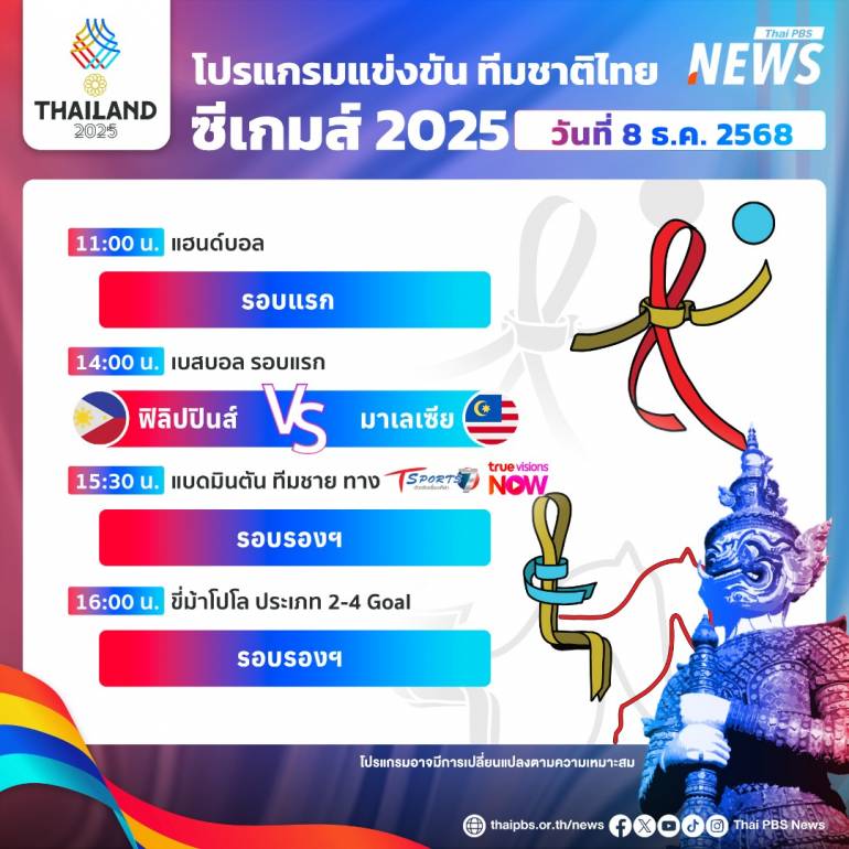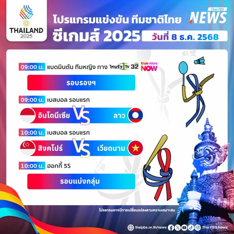 ตารางแข่งขันกีฬาซีเกมส์ 2025 วันที่ 8 ธันวาคม 2568