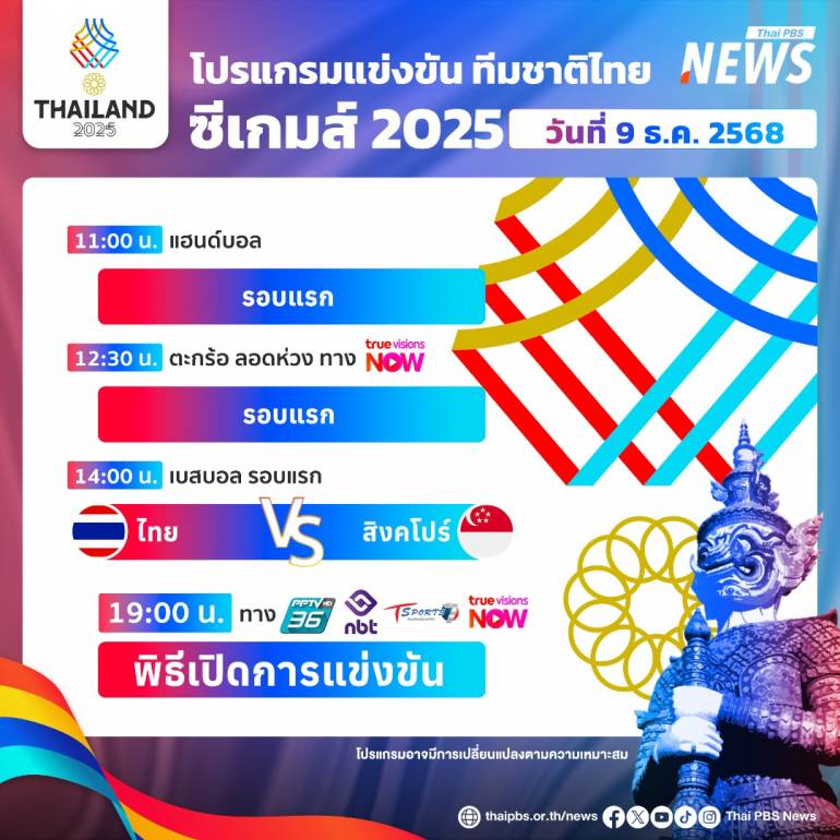 โปรแกรมการแข่งขันกีฬาซีเกมส์ 2025 วันที่ 9 ธันวาคม 2568