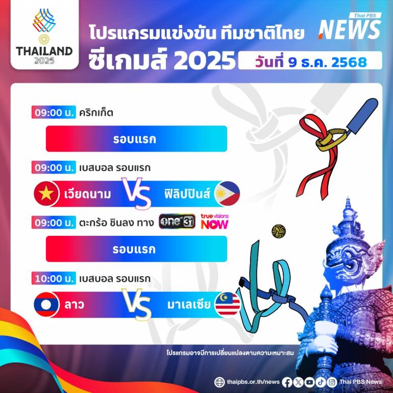 ตารางแข่งขันกีฬาซีเกมส์ 2025 วันที่ 9 ธันวาคม 2568