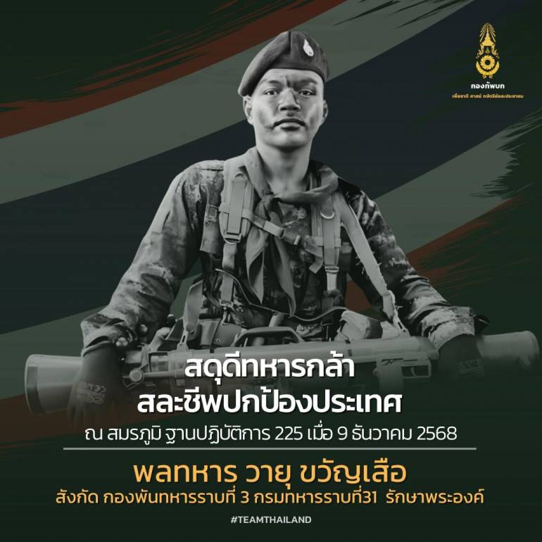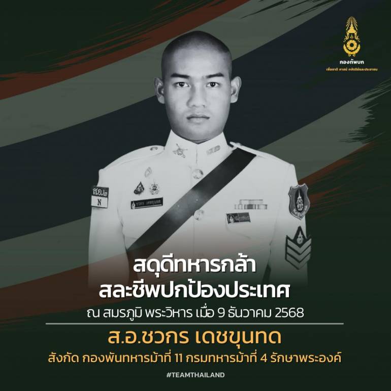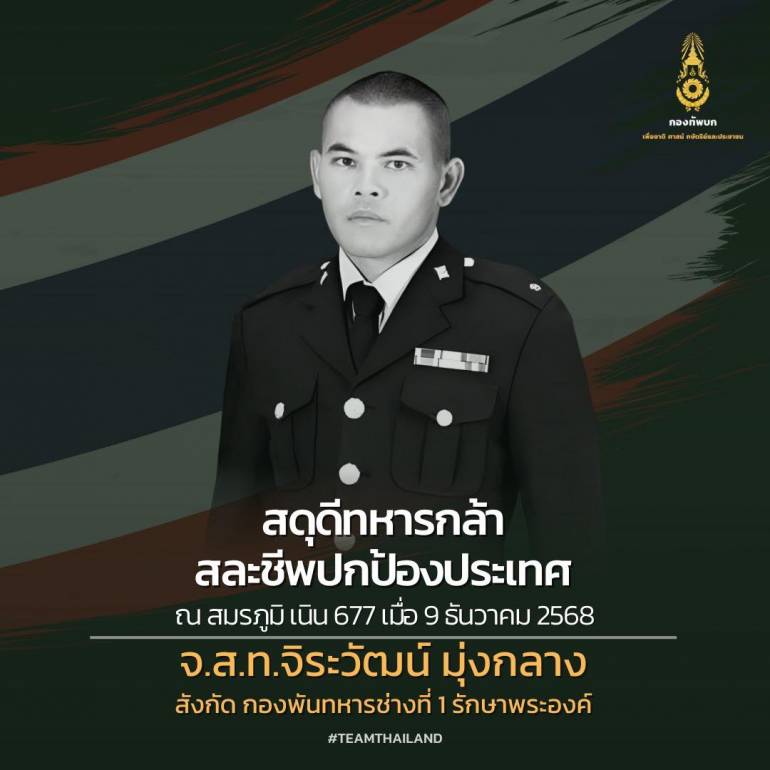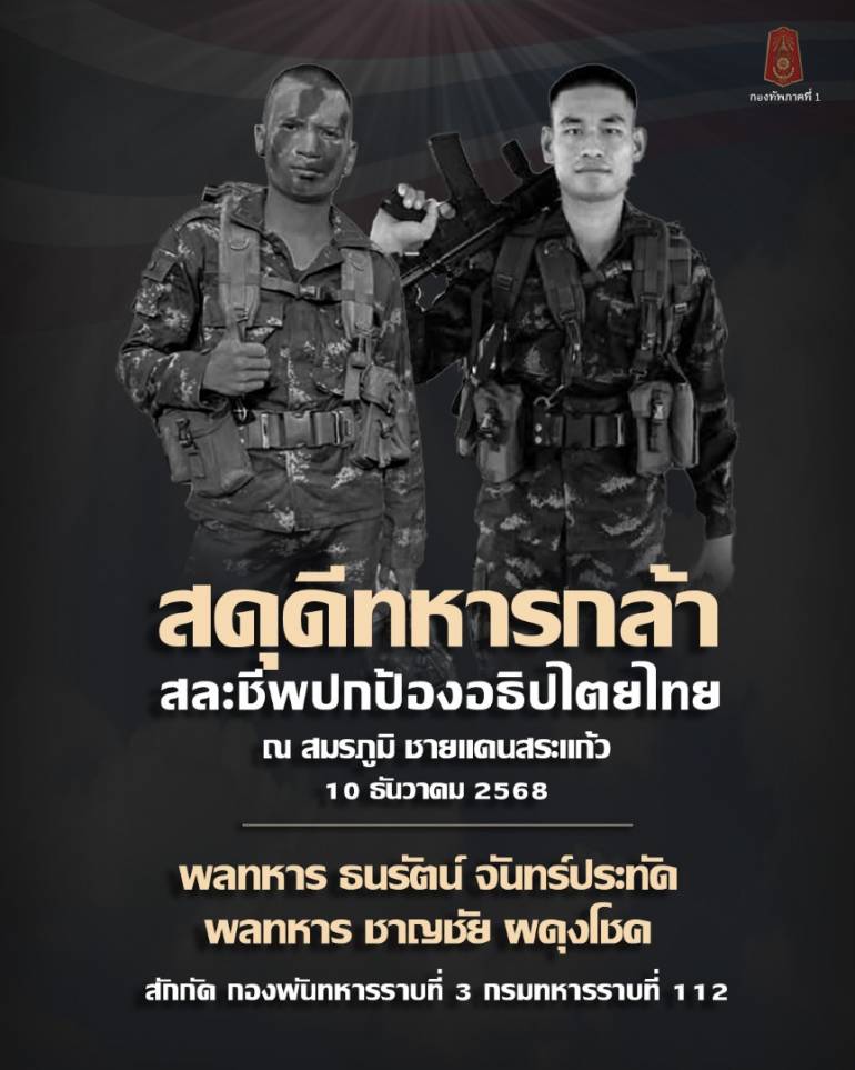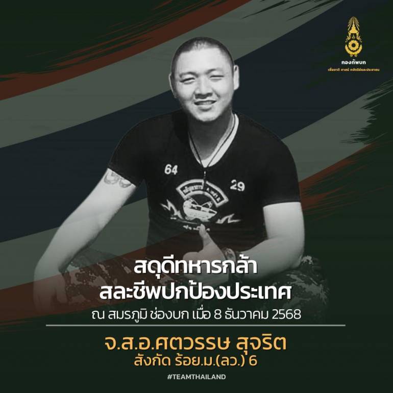 1. จ.ส.อ.ศตวรรษ สุจริต สังกัด ร้อย.ม.(ลว.) 6 พลีชีพปกป้องรักษาอธิปไตยของชาติ หลังถูกยิงถล่มฐานปฏิบัติการป้อมไทย พื้นที่ช่องบก อ.น้ำยืน จ.อุบลราชธานี (8 ธ.ค.2568)