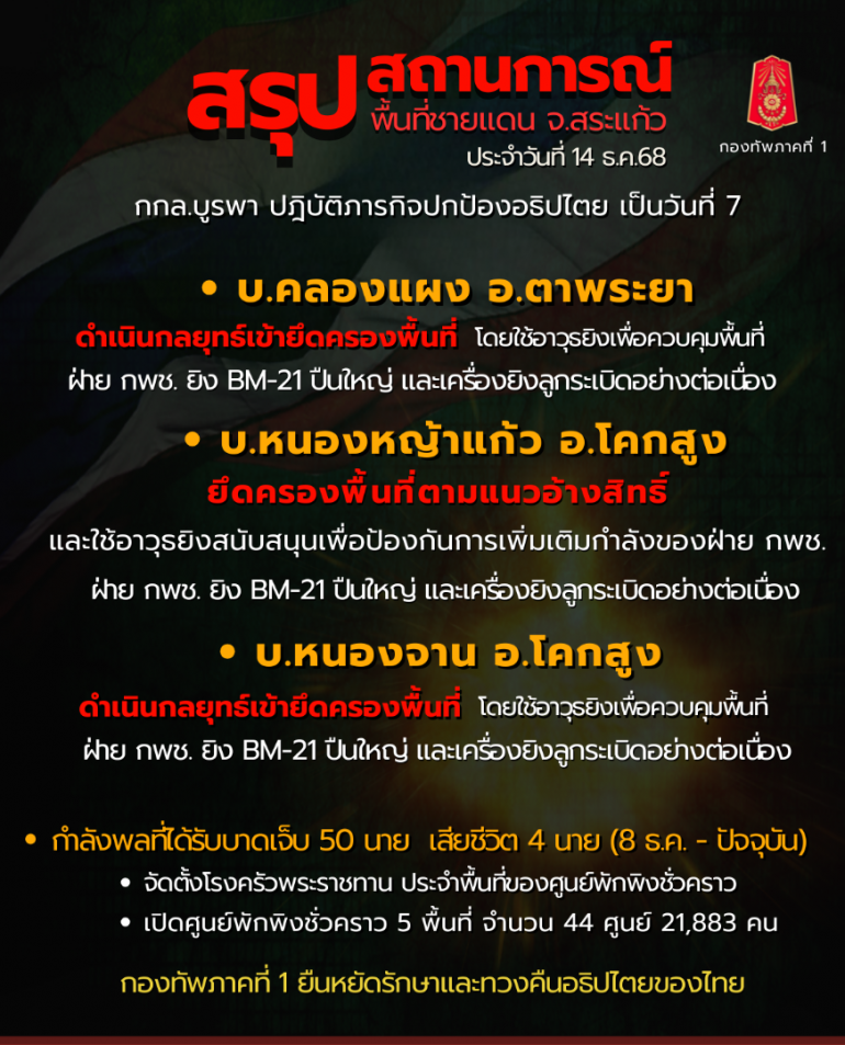 วันนี้ (14 ธ.ค.2568) กองกำลังบูรพา กองทัพภาคที่ 1 ปฏิบัติภารกิจปกป้องอธิปไตยในสถานการณ์ความขัดแย้งไทย-กัมพูชา เป็นวันที่ 7 โดยมีการปฏิบัติที่สำคัญดังนี้