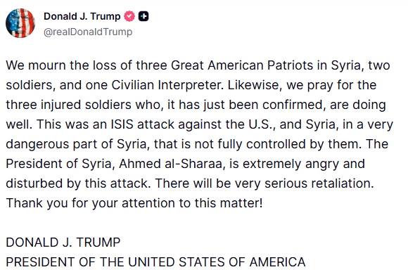 เมื่อวันที่ 13 ธ.ค.2568 ตามเวลาท้องถิ่นสหรัฐฯ CNN รายงาน ปธน.โดนัลด์ ทรัมป์ ของสหรัฐฯ ออกแถลงการณ์ว่า สหรัฐจะมี "การตอบโต้ที่รุนแรงอย่างมาก" หลังเกิดเหตุซุ่มโจมตีในซีเรีย ส่งผลให้ทหารสหรัฐ 2 คน และล่ามพลเรือน 1 คน เสียชีวิต และมีผู้ได้รับบาดเจ็บอีก 3 คน