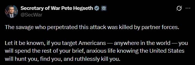 ด้านรัฐมนตรีกลาโหม พีท เฮกเซธ โพสต์ข้อความเตือนผ่านโซเชียลมีเดียว่า "ใครก็ตามที่โจมตีชาวอเมริกัน ไม่ว่าจะที่ใดในโลก จะถูกล่า ถูกพบ และถูกกำจัดอย่างไร้ความปรานี" ด้าน ปธน.ทรัมป์ ยังโพสต์ย้ำเตือนผ่านโซเชียลมีเดียว่า เหตุการณ์นี้เป็นการโจมตีของ ISIS ต่อทั้งสหรัฐฯ และซีเรีย ในพื้นที่อันตรายที่ยังไม่อยู่ภายใต้การควบคุมเต็มรูปแบบ พร้อมย้ำว่าจะมีการตอบโต้ที่รุนแรงอย่างแน่นอน