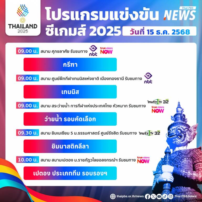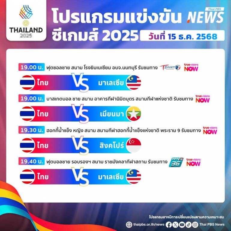 ตารางแข่งขันกีฬาซีเกมส์ 2025 วันที่ 15 ธันวาคม 2568