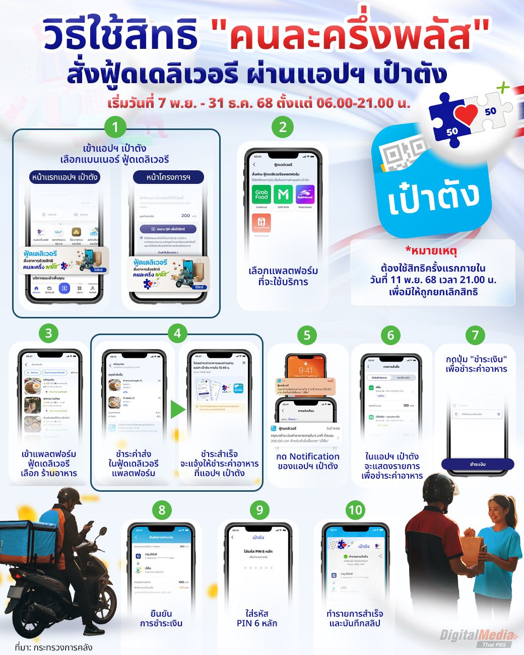 ประชาชนสามารถใช้สิทธิโครงการคนละครึ่งพลัส ร่วมกับฟู้ดเดลิเวอรีแพลตฟอร์ม ได้ตั้งแต่วันที่ 7 พ.ย. - 31 ธ.ค. 2568 โดยสามารถสั่งอาหารได้ตั้งแต่เวลา 06.00 - 21.00 น. หากพบปัญหา กรณีเป็นปัญหาของประชาชน สามารถโทรแจ้งที่ 02-111-1122 กด 2 กรณีเป็นปัญหาของร้านค้า โทรแจ้งที่ 02-111-1122 กด 3 ได้ตลอด 24 ชั่วโมง