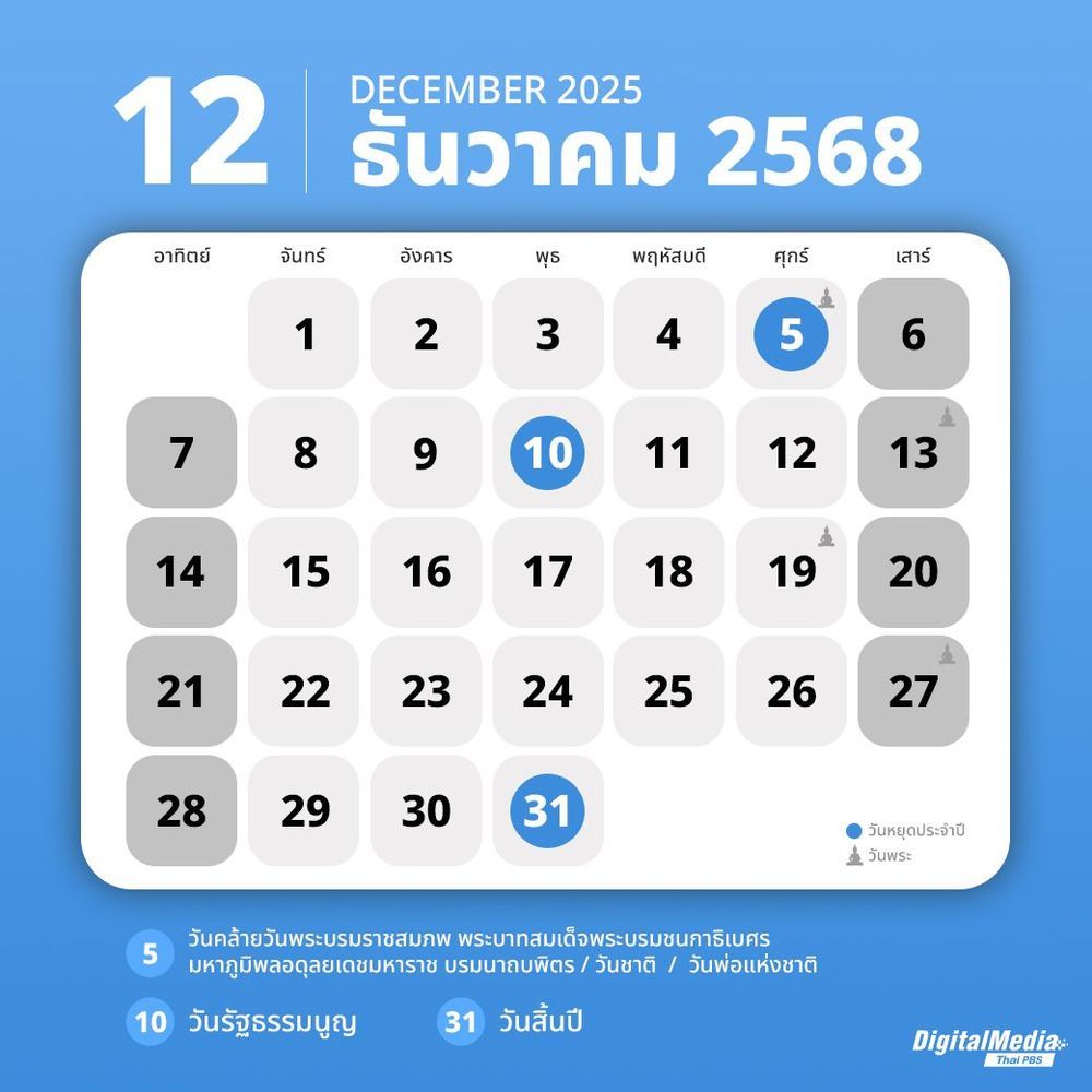 เข้าสู่เดือนธันวาคม เดือนสุดท้ายของปี 2568 เดือนที่เต็มไปด้วยบรรยากาศการเฉลิมฉลอง เดือนธันวาคม 2568 มีวันสำคัญ และงานกิจกรรมมากมาย Thai PBS รวบรวมปฏิทินวันหยุด วันสำคัญ กิจกรรมและสถานที่ท่องเที่ยว และข้อแนะนำช่วงวันหยุดปลายปีมาบอกกัน